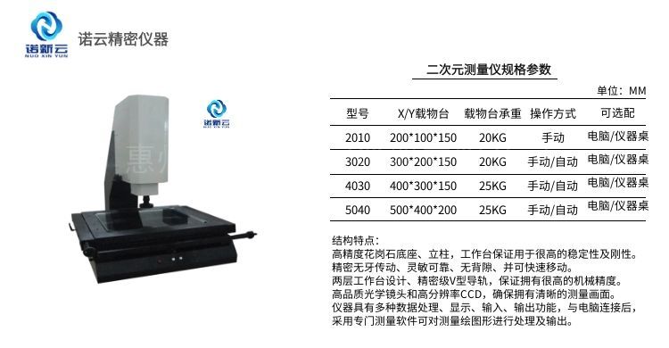 惠州市诺云精密仪器有限公司经营二次元影像仪,二次元测量仪,全自动影像测量仪等产品,另外提供精密仪器维修服务.公司凭借优良的产品、完善的服务和良好的口碑成为各企业的稳定供应商,如有需求,欢迎询问.